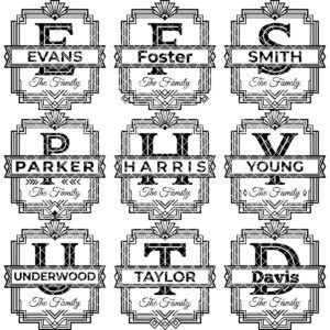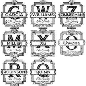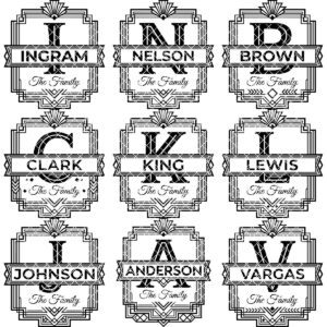 Veredeln Sie Ihre personalisierten Geschenke mit unserem Art-déco-Monogramm-Paket! Mit einem atemberaubenden geometrischen Sonnenstrahlrahmen verwandelt dieses Design jeden Familiennamen in einen beeindruckenden Blickfang für jeden Anlass.