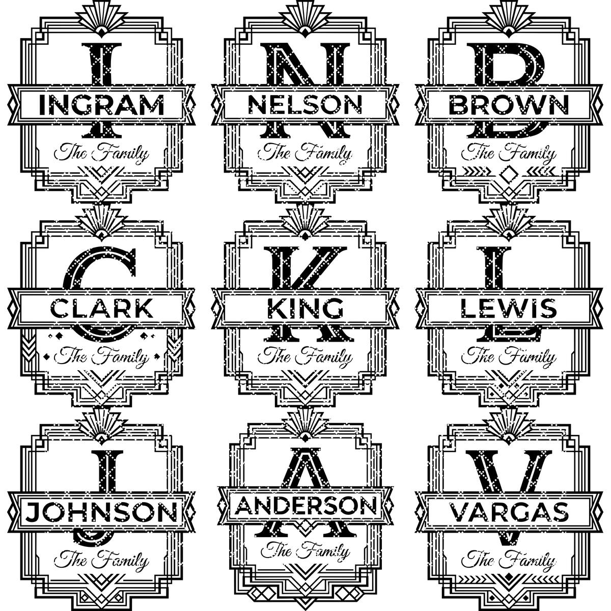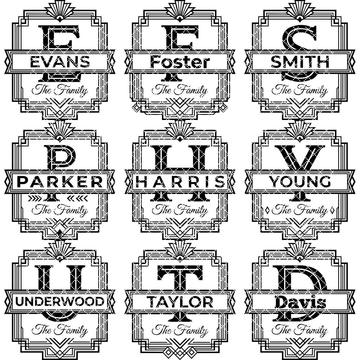 Veredeln Sie Ihre personalisierten Geschenke mit unserem Art-déco-Monogramm-Paket! Mit einem atemberaubenden geometrischen Sonnenstrahlrahmen verwandelt dieses Design jeden Familiennamen in einen beeindruckenden Blickfang für jeden Anlass.