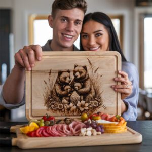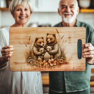 Verwandeln Sie Ihre Küche mit unserem „Bärenfamilie teilt Honigwabe“ Charcuterie-Brett-Design, perfekt, um Ihrem Zuhause einen Hauch von rustikalem Charme zu verleihen. Dieses entzückende Kunstwerk zeigt eine liebevolle Bärenfamilie, die sich um eine Honigwabe versammelt hat und eine warme, einladende Atmosphäre für jeden Anlass schafft.
