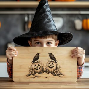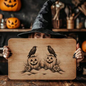 Veredeln Sie Ihre Halloween-Feierlichkeiten mit unserer Kürbis-Raben-Wurstplatten-Gravurdatei. Dieses einzigartige Design verleiht jeder Herbstzusammenkunft eine gruselige, elegante Note und macht Ihre Partydekoration unvergesslich.