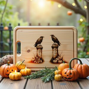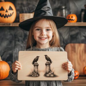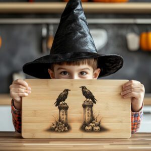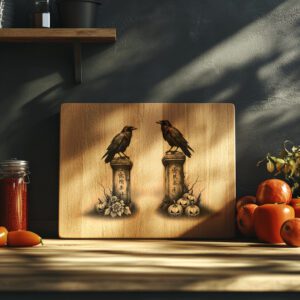 Verleihen Sie Ihren Halloween-Treffen mit unserer exklusiven Lasergravurdatei für Wurstplatten eine besondere Note. Mit einem gespenstischen, gotischen Zwillingsraben-Motiv verwandelt dieses Design jede Platte sofort in ein fesselndes Herzstück.