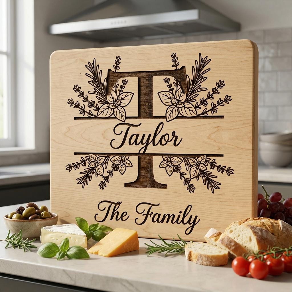 Entdecken Sie die perfekte individuelle Note für Ihre Küchen- oder Hochzeitsgeschenke mit unserem Kräuter-Monogramm-Paket. Jedes Alphabet-Design weist charmante rustikale Details auf, ideal zum Gravieren von Familiennamen auf Brettern und Dekorationen.