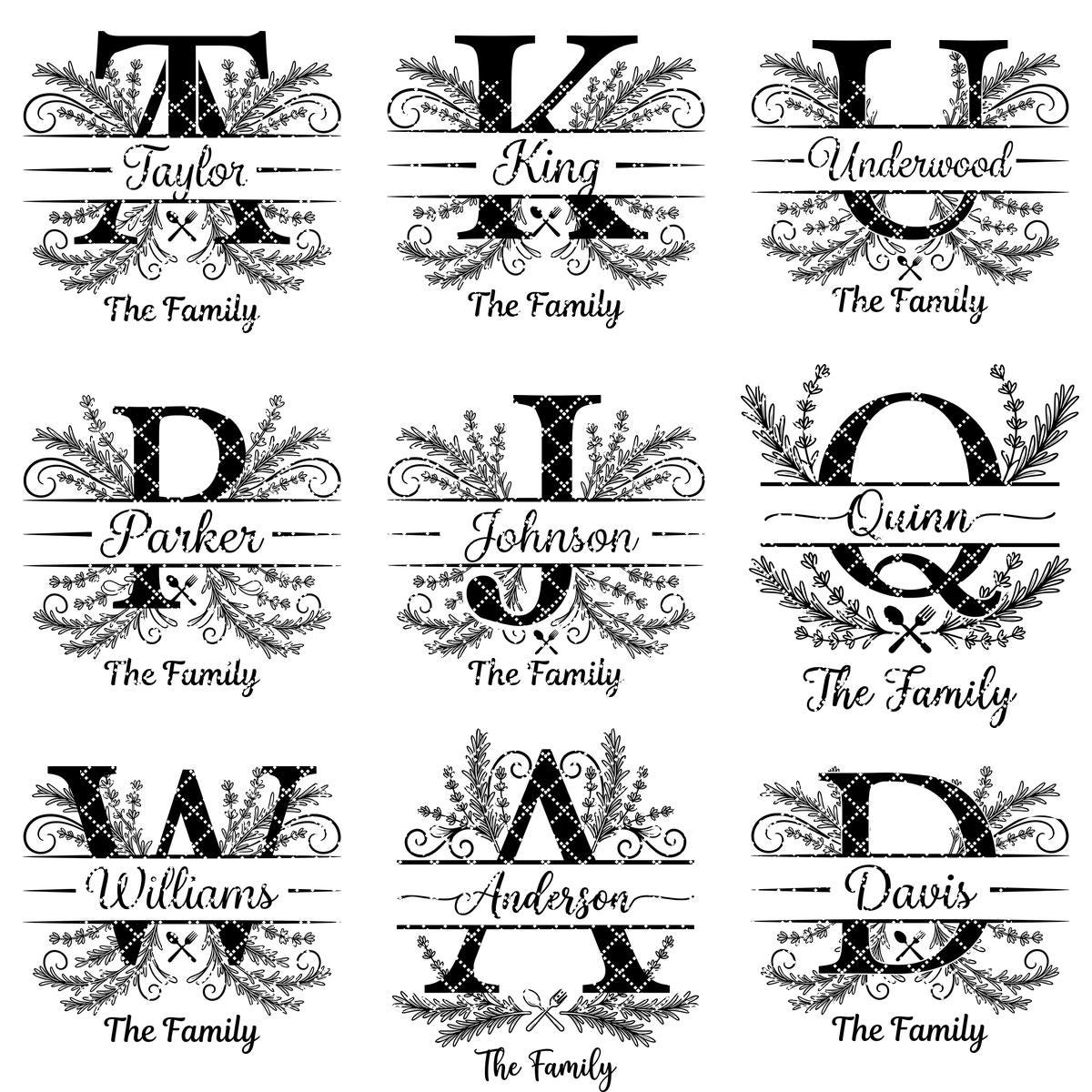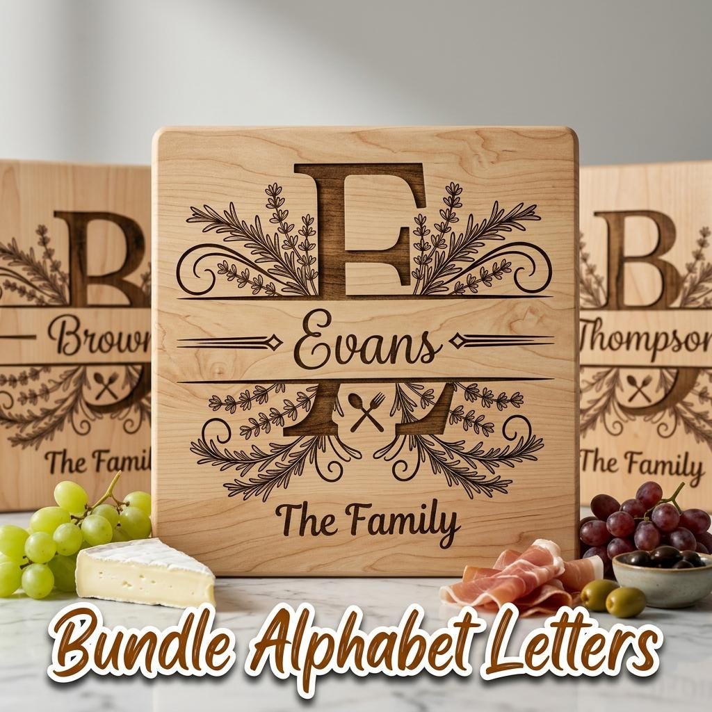 Verwandeln Sie Ihre Küchenutensilien mit unserem Monogramm-Bundle, maßgeschneidert für Lasergravierer wie Lightburn und Glowforge. Personalisierte Familiennamen und kreative Kräuter- und Utensilien-Alphabete machen jedes Stück zu etwas ganz Besonderem.