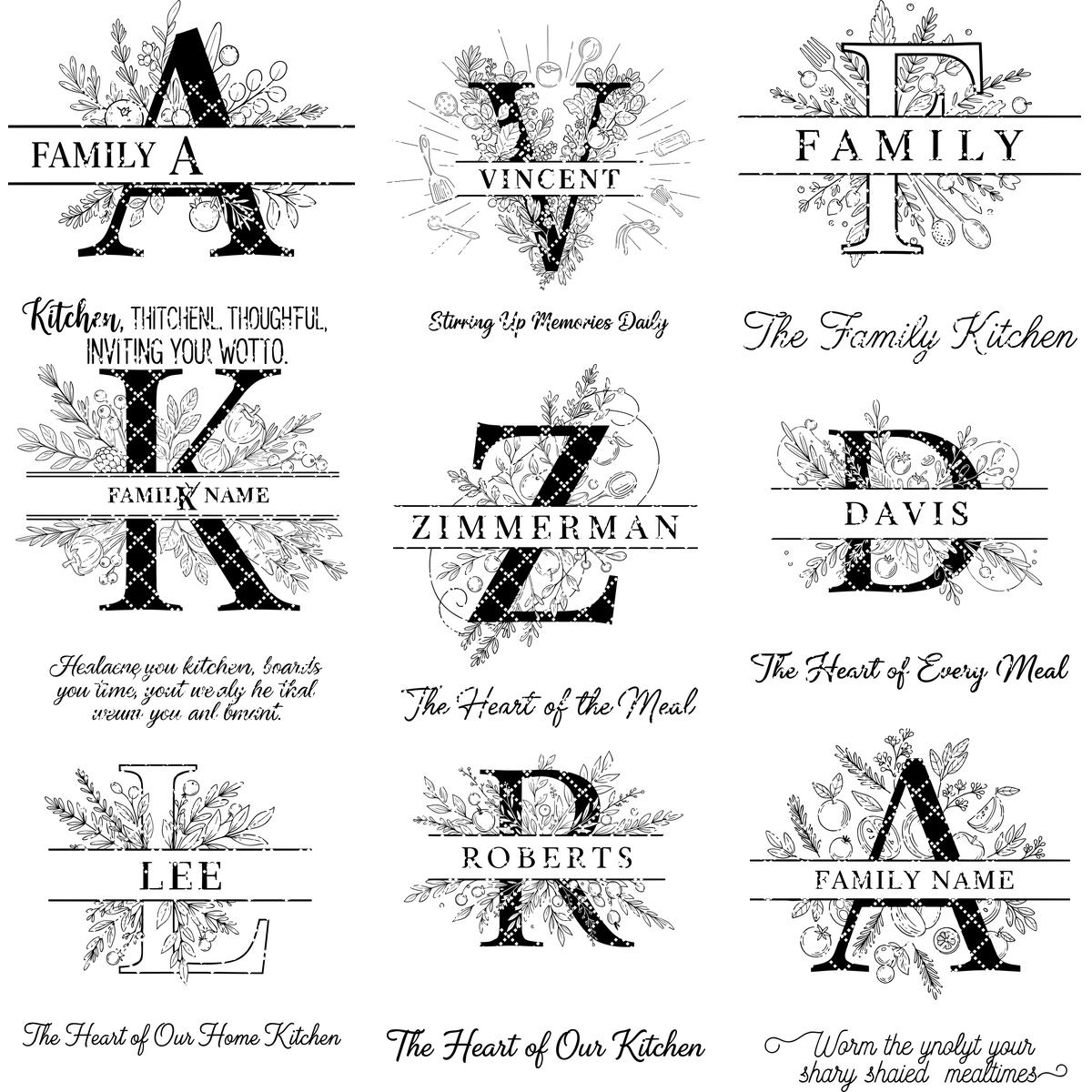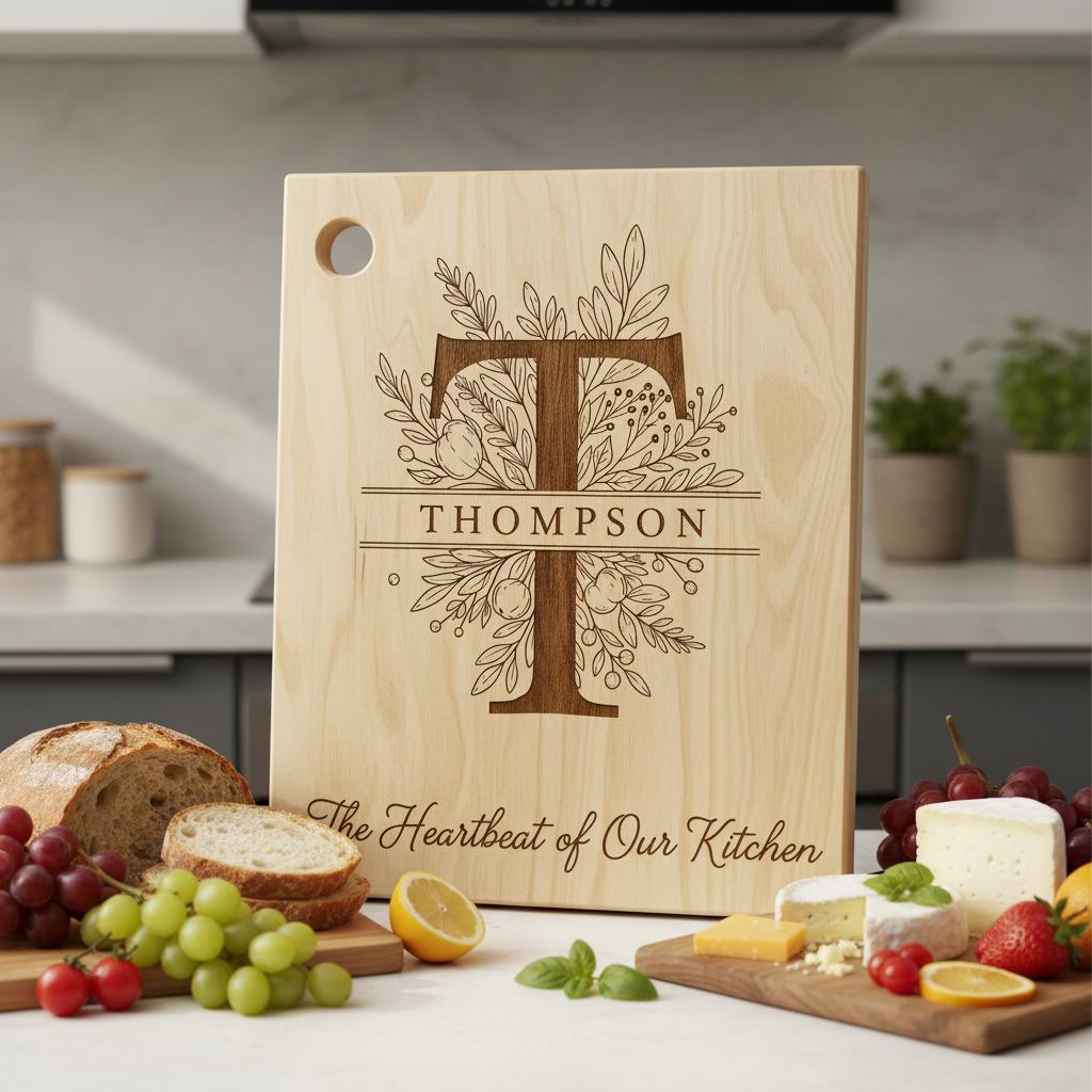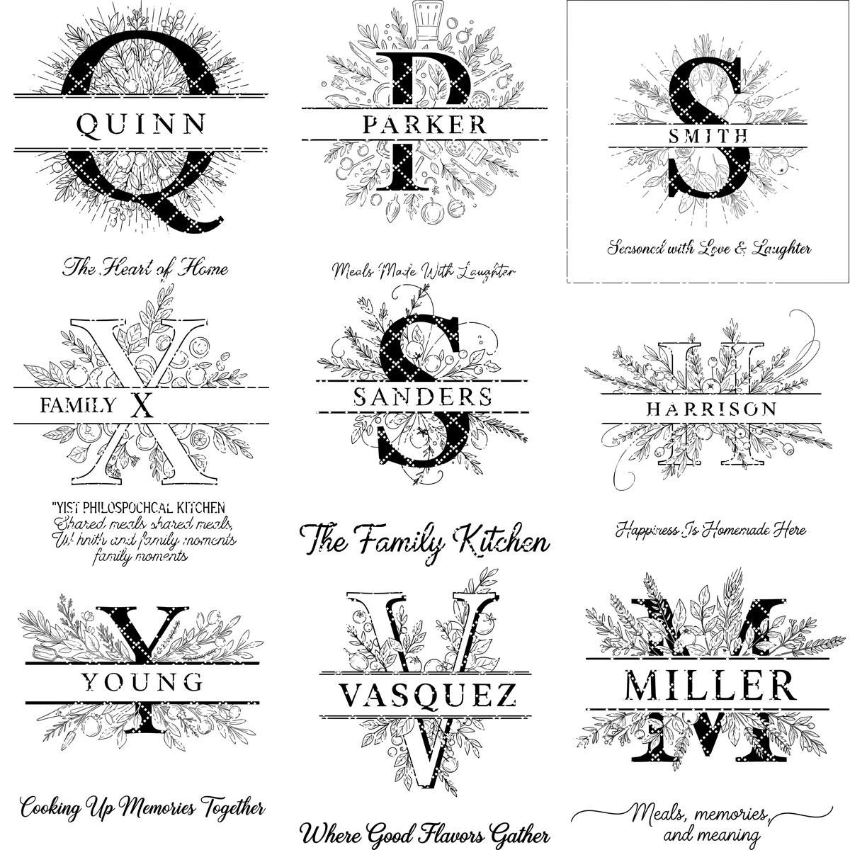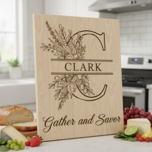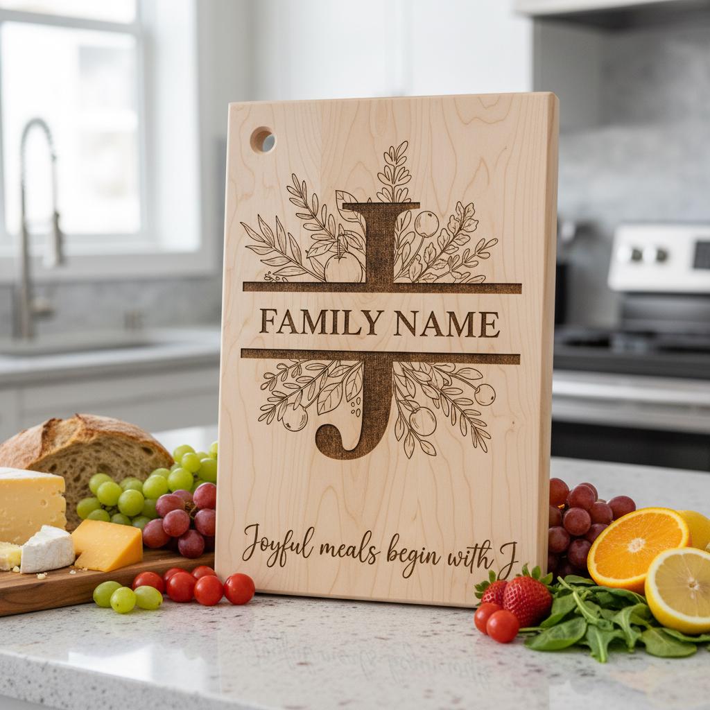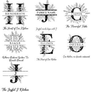 Unsere botanische Monogramm-Kollektion ist das perfekte Hochzeitsgeschenk oder Familienerbstück. Beeindrucken Sie Ihre Lieben, indem Sie ihren Familiennamen mit einem eleganten SVG-Design verewigen, das in jeder Küche hervorsticht. Entdecken Sie die Kunst der personalisierten Gravur und machen Sie jede Mahlzeit zu einem Fest.