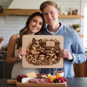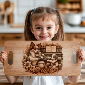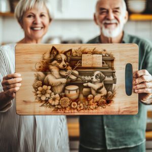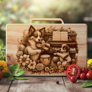 Veredeln Sie Ihre Küche mit unserer Laser-Gravurdatei für Charcuterie-Bretter, die eine entzückende Szene eines Familienhundes zeigt, der Klavier und Geige spielt. Dieses verspielte Design verleiht jedem Zuhause eine einzigartige, herzerwärmende Note und macht es zu einem perfekten Gesprächsanlass für Zusammenkünfte.