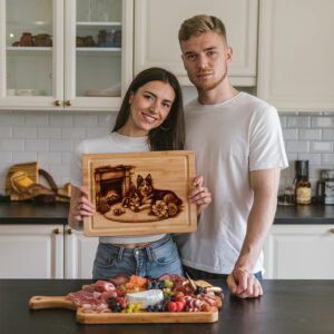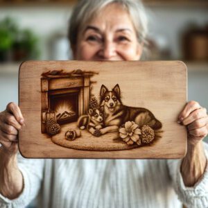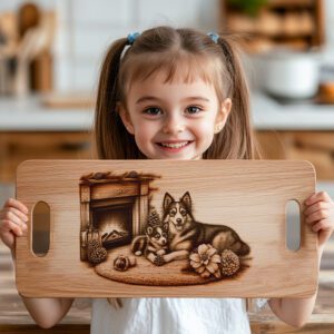 Verwandeln Sie Ihre festliche Küchendekoration mit unserer Laser-Gravurdatei für Charcuterie-Bretter, die ein bezauberndes Familienhund-am-Kamin-Design zeigt. Dieses herzerwärmende Muster verleiht jedem Beisammensein eine gemütliche, festliche Note und macht Ihr Brett zum Mittelpunkt jeder Feier.