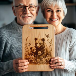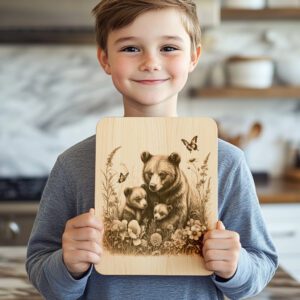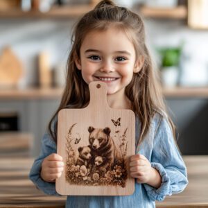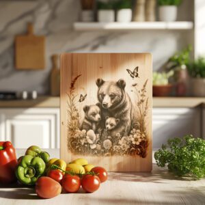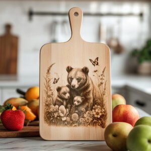 Veredeln Sie Ihre Küchendekoration mit unserer Charcuterie-Brett Laser Gravur Datei, die ein bezauberndes Bärenfamilie-Garten Design zeigt. Dieser rustikale Waldstil bringt sofort Wärme und Charakter in jeden Raum und macht ihn perfekt für Familienfeiern und gemütliche Abende.