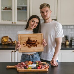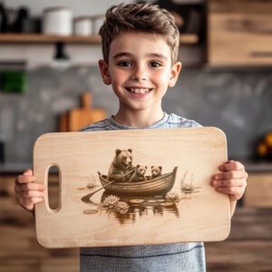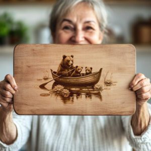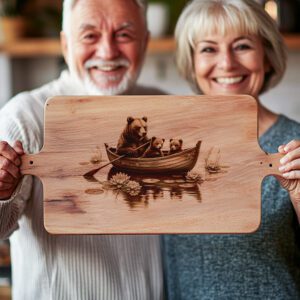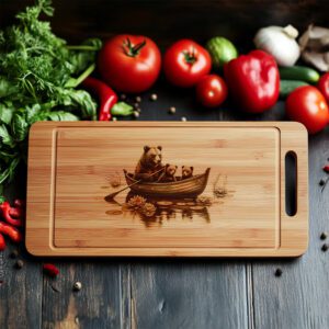 Verleihen Sie Ihrer Küchenatmosphäre mit unserer Charcuterie Brett Laser Gravur Datei eine besondere Note, die ein bezauberndes Bären-im-Boot-auf-dem-Wasser-Design bietet. Diese rustikale Kunstvorlage verleiht Wärme und Charakter und macht jedes Treffen unvergesslich.