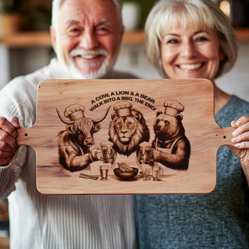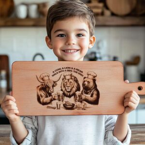 ¡Desata tu creatividad con nuestro vibrante archivo de grabado láser para tabla de charcutería! Con adorables vacas de las Highlands, majestuosos leones y juguetones osos, este diseño (#061) añade un toque de encanto caprichoso a cualquier cocina.