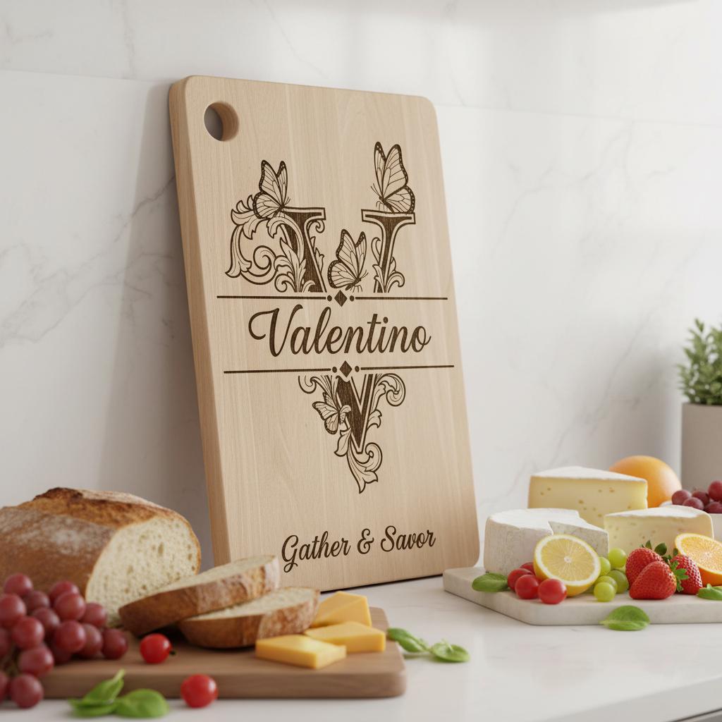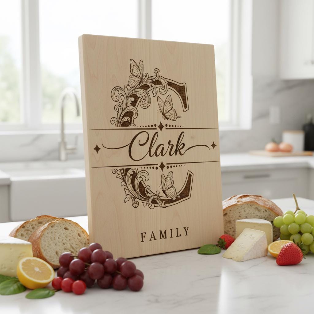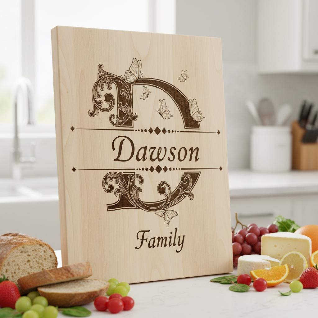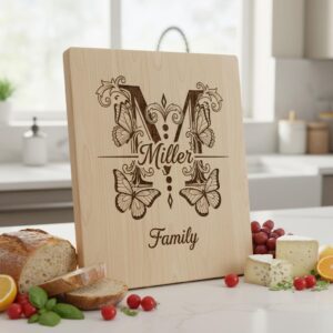 Eleva tu cocina con este diseño de tabla de charcutería monograma bellamente elaborado. Perfecto para personalizar tablas con nombres familiares, añade un toque vintage y elegante a tus presentaciones de comida. Elaborado con intrincados detalles de grabado, este archivo es ideal para crear recuerdos atemporales.