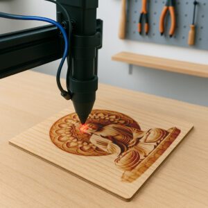 - La madera preferida para el grabado es el tilo/abedul o madera clara con potencia de configuración: 20-30%, velocidad: 300-400 mm/s, DPI: 300-600.
