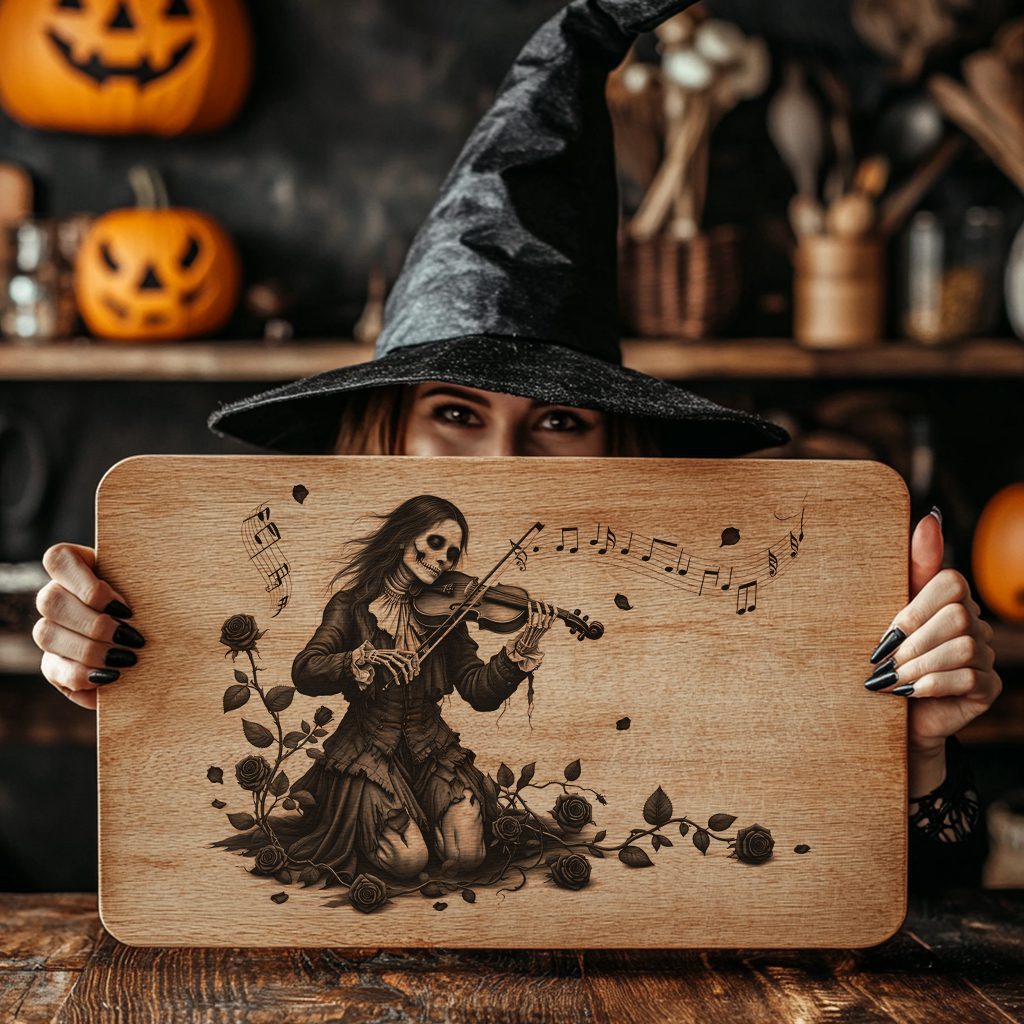 Libera el encanto espeluznante de Halloween con nuestro archivo de grabado del Violinista Maldito, diseñado para transformar tus tablas de embutidos en obras maestras inquietantes. Perfecto para cualquiera que ame el arte gótico y espeluznante, este diseño garantiza que tus reuniones destaquen con un estilo inolvidable.