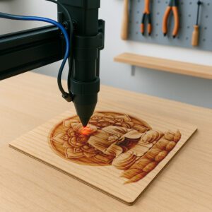 - La madera preferida para el grabado es el tilo/abedul o madera clara con potencia de configuración: 20-30%, velocidad: 300-400 mm/s, DPI: 300-600.