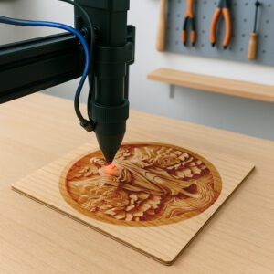- La madera preferida para el grabado es el tilo/abedul o madera clara con potencia de configuración: 20-30%, velocidad: 300-400 mm/s, DPI: 300-600.