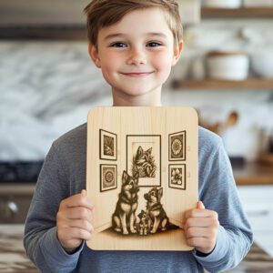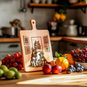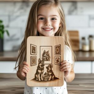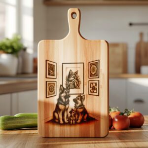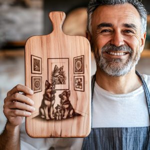 Eleva tu espacio de entretenimiento con nuestro archivo de grabado láser para tabla de charcutería, que presenta un encantador diseño de Galería de Arte de Perro Familiar. Esta pieza destacada aporta calidez y personalidad a tu cocina, haciendo que cada reunión sea memorable.