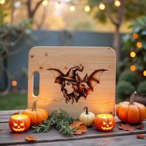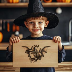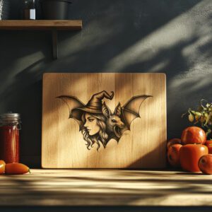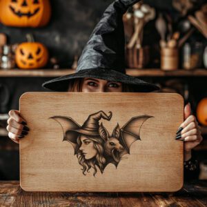 Eleva tus celebraciones de Halloween con nuestro exclusivo archivo de grabado láser, diseñado para tablas de embutidos y decoración festiva. Con una cautivadora silueta de bruja y murciélago, este diseño promete encantar a tus invitados y crear el ambiente espeluznante perfecto.