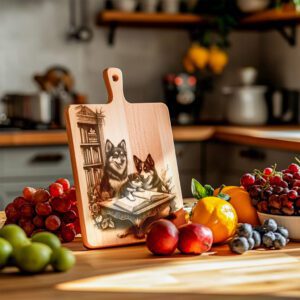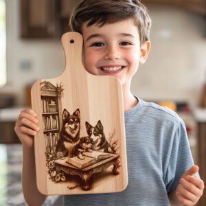Eleva la decoración de tu cocina con nuestro archivo de grabado láser para tabla de charcutería, que presenta un perro familiar caprichoso leyendo un libro. Este diseño exclusivo aporta calidez y encanto a cualquier hogar, convirtiéndolo en un tema de conversación encantador en reuniones y cenas familiares.