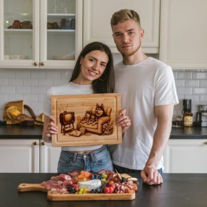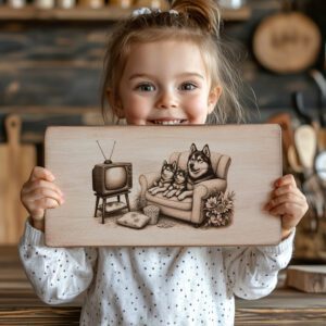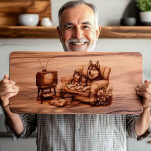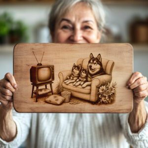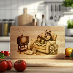 Eleva la decoración de tu cocina con nuestro archivo de grabado láser para tabla de charcutería, que presenta unos Huskies juguetones viendo la televisión en el sofá. Este encantador diseño aporta un toque de fantasía y calidez a cualquier espacio, convirtiéndolo en una adición destacada a tu hogar.