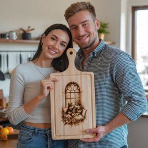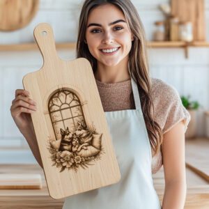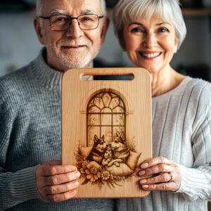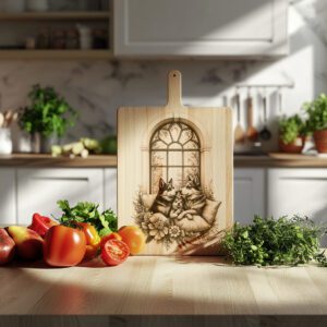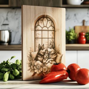 Eleva la decoración de tu cocina con nuestro archivo de grabado láser para tabla de charcutería, que presenta un conmovedor diseño de marco de ventana con una familia Husky. Esta pieza única aporta un toque de encanto rústico y personalidad a tu hogar, perfecta para reuniones y para el uso diario.