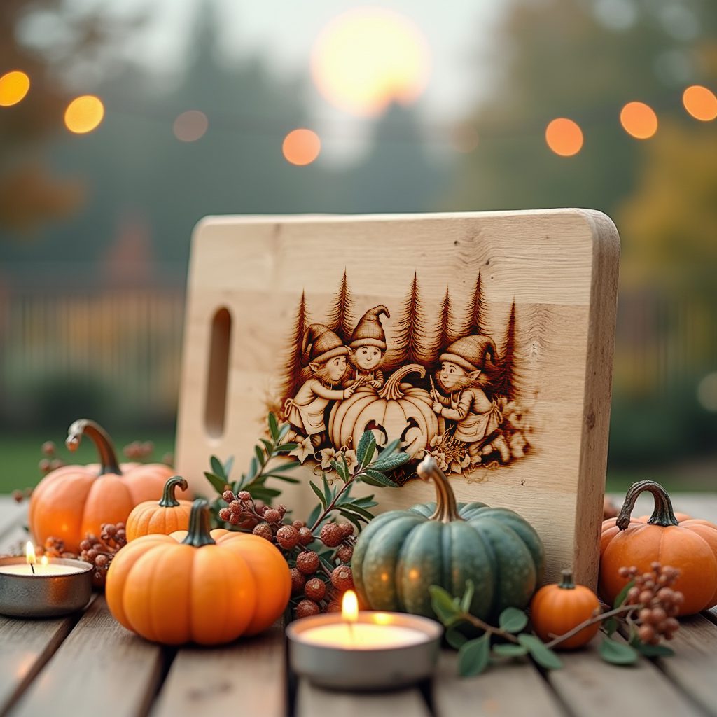 Eleva tus celebraciones de Halloween con nuestro archivo de grabado láser exclusivo para tabla de charcutería de Halloween. Con gnomos caprichosos esculpiendo encantadoras linternas de calabaza, este diseño aporta un toque festivo a cualquier reunión y hace que tus tablas de servir destaquen.