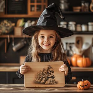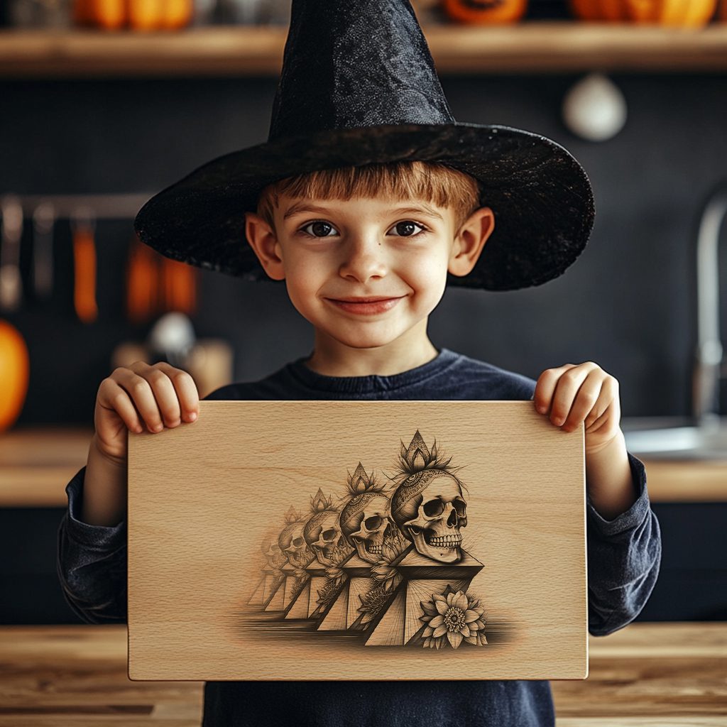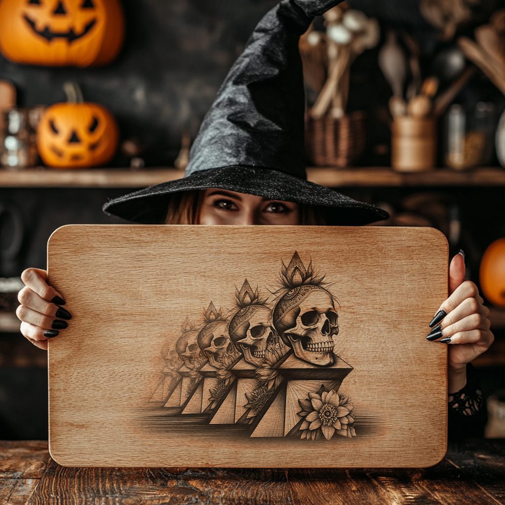 Eleva tus reuniones de Halloween con nuestro exclusivo archivo de grabado láser para tabla de charcutería, que presenta intrincadas calaveras elegantemente posadas en una exhibición de pedestal. Este diseño transforma instantáneamente cualquier surtido en un centro de mesa cautivador, perfecto para impresionar a tus invitados.