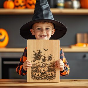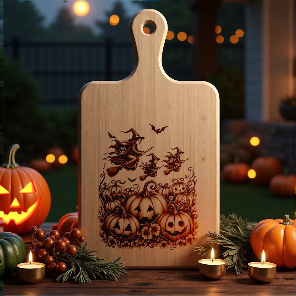 Eleva tus celebraciones de Halloween con nuestro exclusivo archivo de grabado láser para tabla de embutidos, que presenta un aquelarre de brujas fascinante sobre un místico campo de calabazas. Este diseño único transforma instantáneamente cualquier tabla en una pieza central llamativa para tus reuniones espeluznantes.