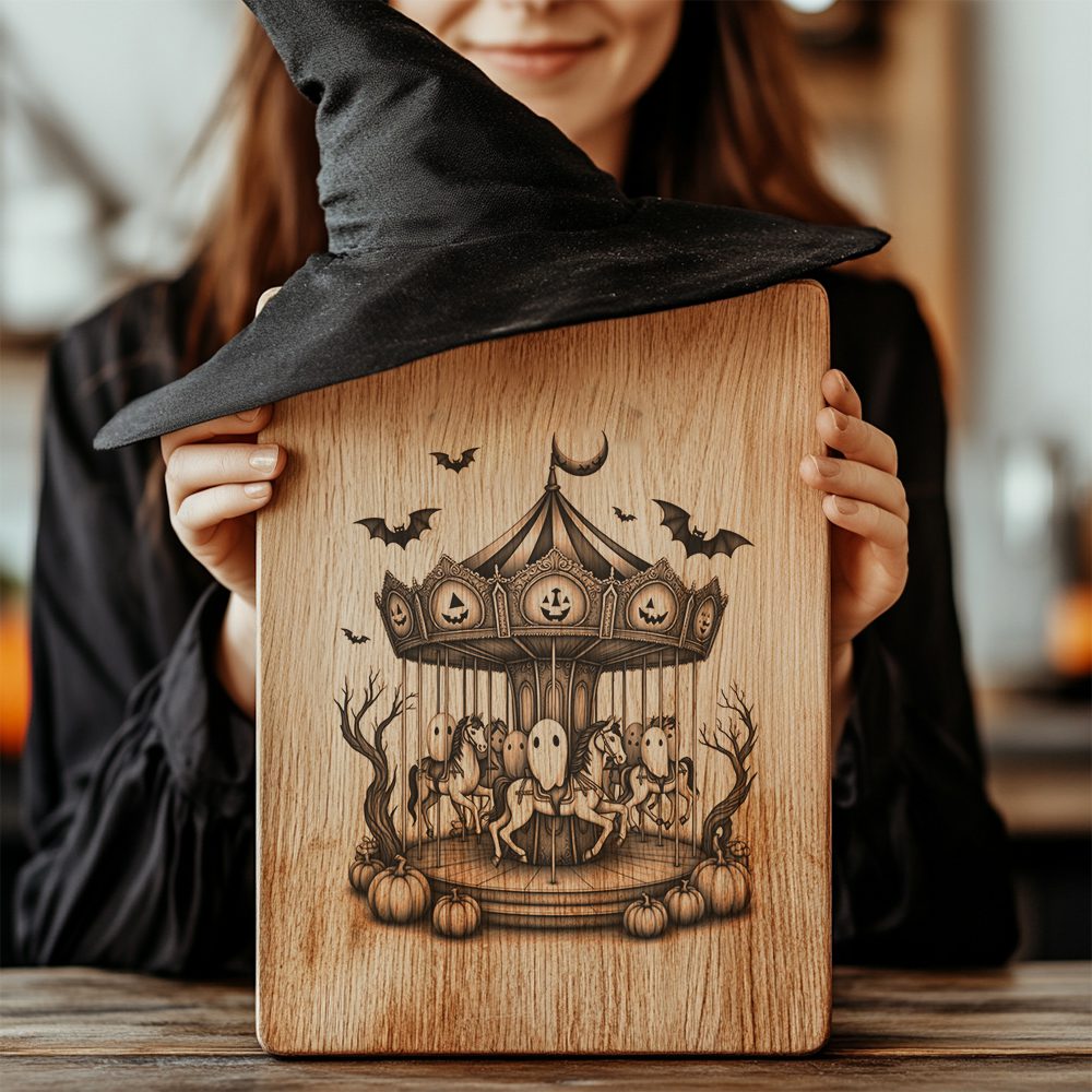 Eleva tus reuniones de Halloween con el archivo de grabado láser del carrusel fantasmal a la luz de la luna para tabla de charcutería. Este diseño encantador transforma instantáneamente tablas ordinarias en centros de mesa inolvidables, deleitando a los invitados y generando conversación.