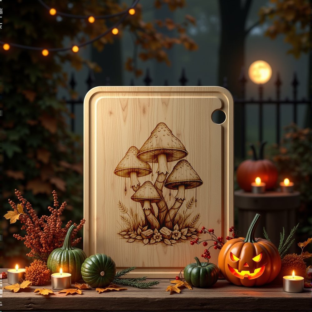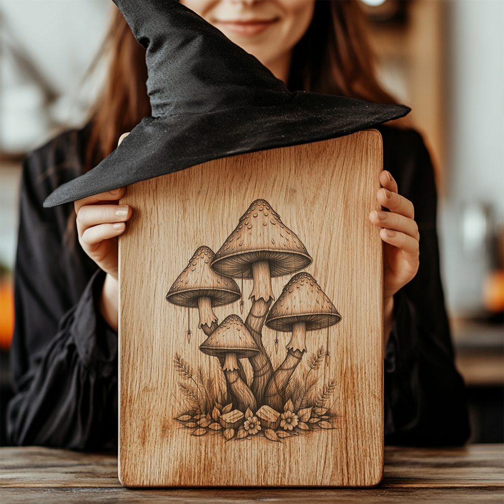 Eleva tus reuniones de Halloween con nuestro exclusivo archivo de grabado láser para tabla de charcutería, con un encantador diseño de sombrero de bruja y racimo de setas. Perfecto para añadir un toque mágico a tu mesa festiva, este archivo promete impresionar a tus invitados.