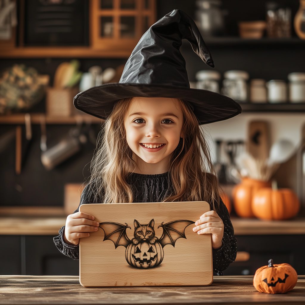 Eleva tus reuniones de Halloween con nuestro archivo de grabado exclusivo, diseñado para tablas de embutidos y bandejas para servir. Esta fusión única de Gato-Murciélago-Calabaza trae encanto festivo y estilo espeluznante a tu mesa, cautivando a los invitados con su detalle imaginativo.