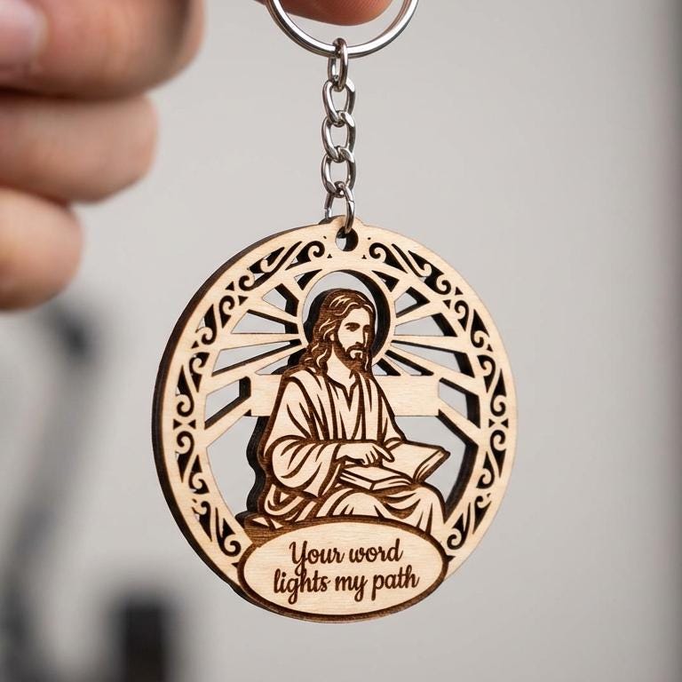 Ilumina tu camino diario con creaciones inspiradas en la fe. Este llavero de Jesús con un diseño único es la forma perfecta de llevar las escrituras devocionales a dondequiera que vayas, recordándote que Su palabra ilumina tu sendero.