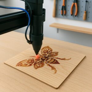 - La madera preferida para el grabado es el tilo/abedul o madera clara con potencia de configuración: 20-30%, velocidad: 300-400 mm/s, DPI: 300-600.
