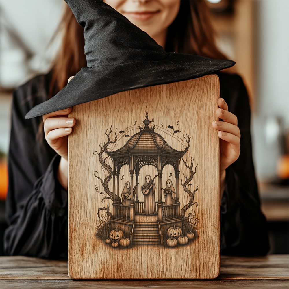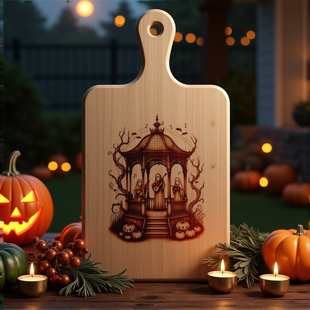 Eleva tu presentación de Halloween con el Archivo Láser para Tabla de Charcutería de Halloween con Músicos Espectrales. Este encantador diseño presenta una glorieta a la luz de la luna donde músicos fantasmales tocan, creando el ambiente espeluznante perfecto para tu celebración.