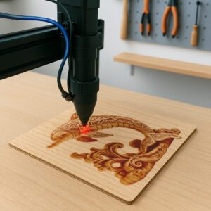 - La madera preferida para el grabado es el tilo/abedul o madera clara con potencia de configuración: 20-30%, velocidad: 300-400 mm/s, DPI: 300-600.