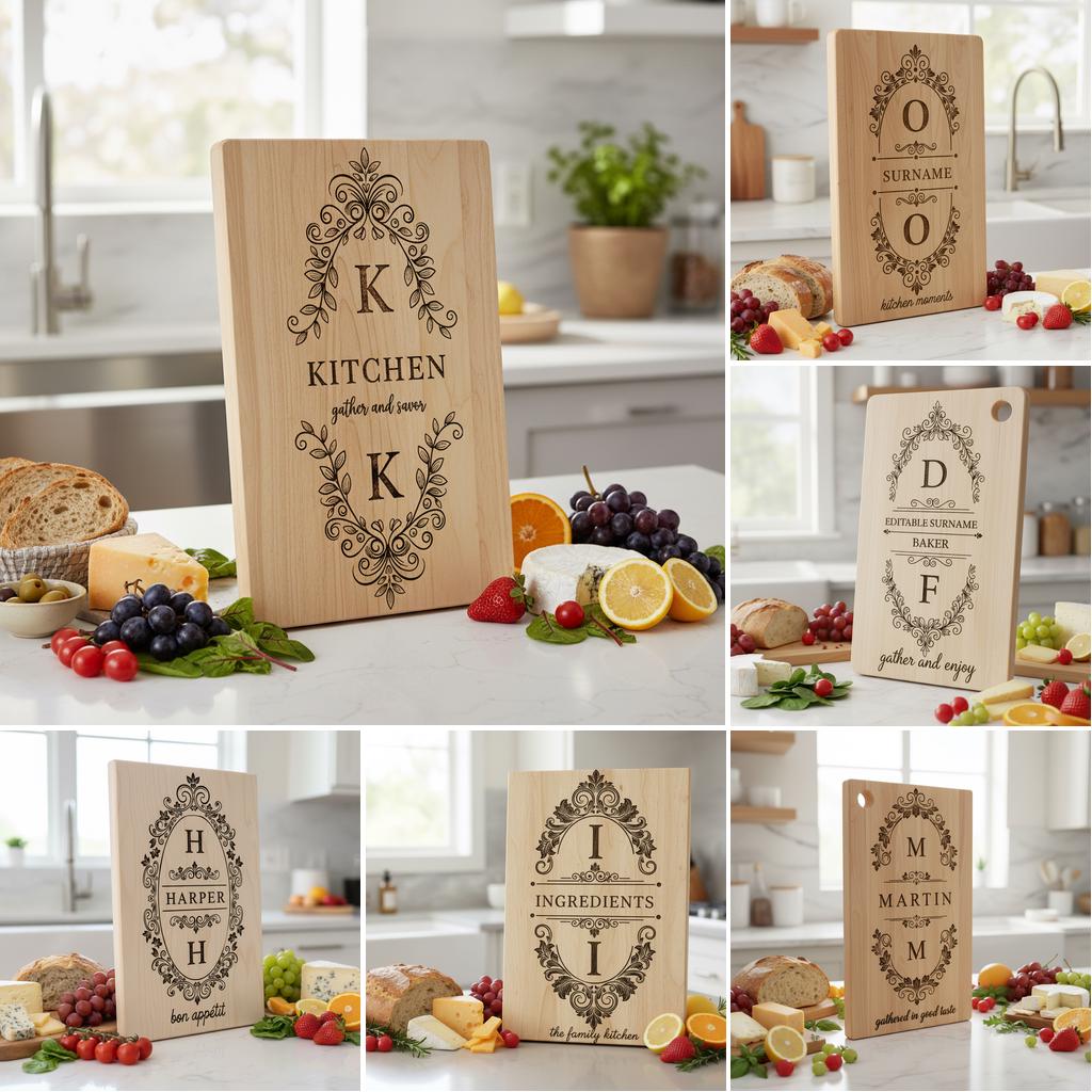 Eleva tus regalos y la decoración de tu hogar con nuestro Paquete de Monogramas para Tablas de Charcutería. Diseñados con precisión, estos diseños te permiten añadir un toque personalizado, haciendo que cada ocasión sea aún más memorable.