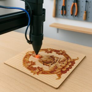 * Le bois recommandé pour la gravure est le tilleul/bouleau ou un bois clair avec les réglages suivants : Puissance : 20-30 %, Vitesse : 300-400 mm/s,