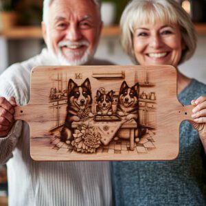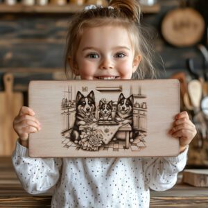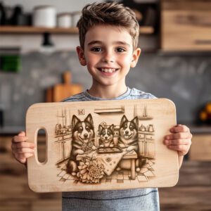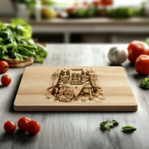 Nous vous présentons notre fichier de gravure laser pour planche à charcuterie, arborant un motif réconfortant de famille canine dans une cuisine pâtissière, qui apporte de la joie à n’importe quelle maison. Ce motif ajoute une touche charmante à votre espace culinaire et célèbre votre amour pour les animaux de compagnie et la nourriture.
