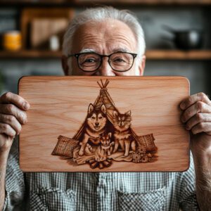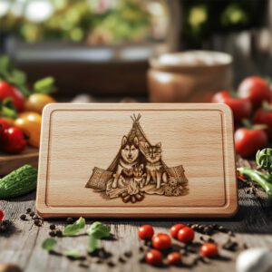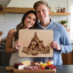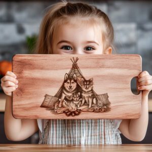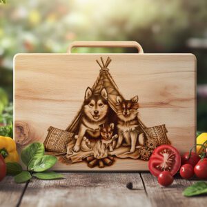 Sublimez la décoration de votre cuisine avec notre fichier de gravure laser exclusif pour planche à charcuterie, mettant en vedette un chien de famille attachant niché à côté d’un charmant tipi. Ce design unique ajoute une touche rustique et accueillante à n’importe quelle maison, faisant de votre planche un sujet de conversation instantané lors de vos rassemblements.