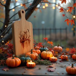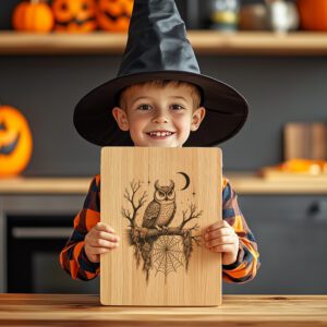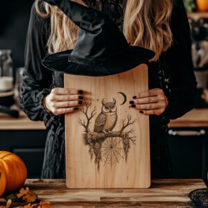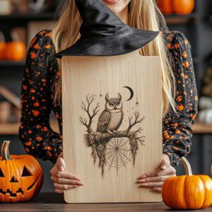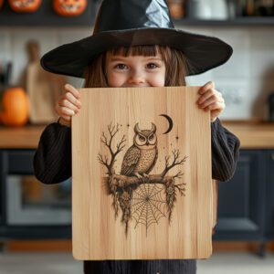 Ajoutez une touche envoûtante à vos rassemblements d’Halloween avec notre planche à charcuterie gravée au laser, ornée d’un hibou mystérieux perché sur une branche effrayante. Ce design enchanteur capture l’esprit de la saison et ne manquera pas d’impressionner vos invités.