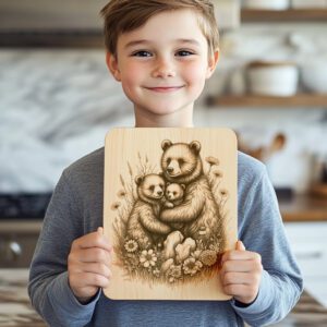 Parfait pour offrir ou pour embellir votre propre espace, ce magnifique design transforme des planches ordinaires en souvenirs précieux. Apportez chaleur, style et une touche de nature sauvage à votre intérieur grâce à notre modèle de gravure exclusif Famille Ours dans la Prairie.