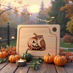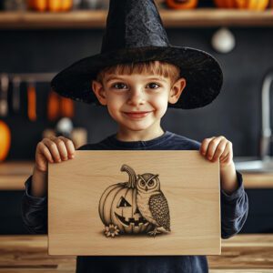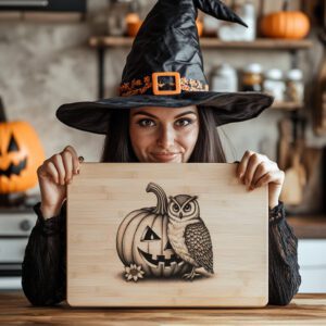 Libérez l’esprit d’Halloween avec notre fichier de gravure laser exclusif pour planche de charcuterie. Mettant en scène une fusion hypnotisante d’une citrouille et d’un hibou aux yeux de bougie scintillants, ce design apporte une touche festive unique à votre décoration et à vos réceptions de fin d’année.