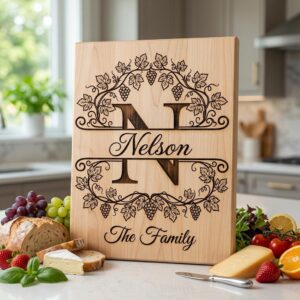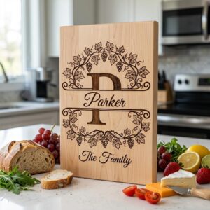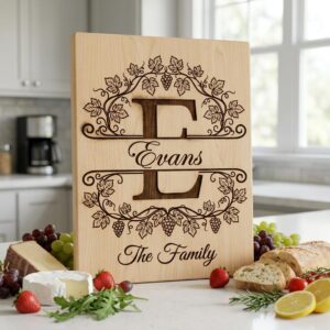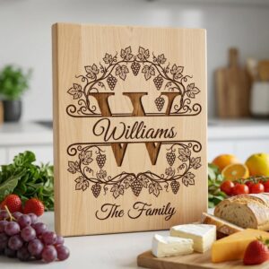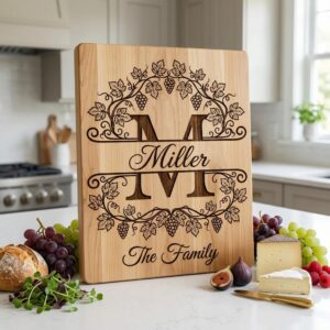 Transformez vos indispensables de cuisine avec notre design Monogramme Vignoble Vintage, parfait pour personnaliser n’importe quelle planche. Ajoutez une touche sophistiquée avec un nom de famille personnalisé, rendant votre cadeau vraiment unique.