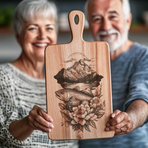Impreziosisci i tuoi taglieri di formaggi o altri alimenti con questa deliziosa raffigurazione della bellezza della natura. Con un salmone vivido, una maestosa montagna e delicati fiori, questa raffigurazione cattura l’essenza degli ampi spazi aperti in intricati dettagli.