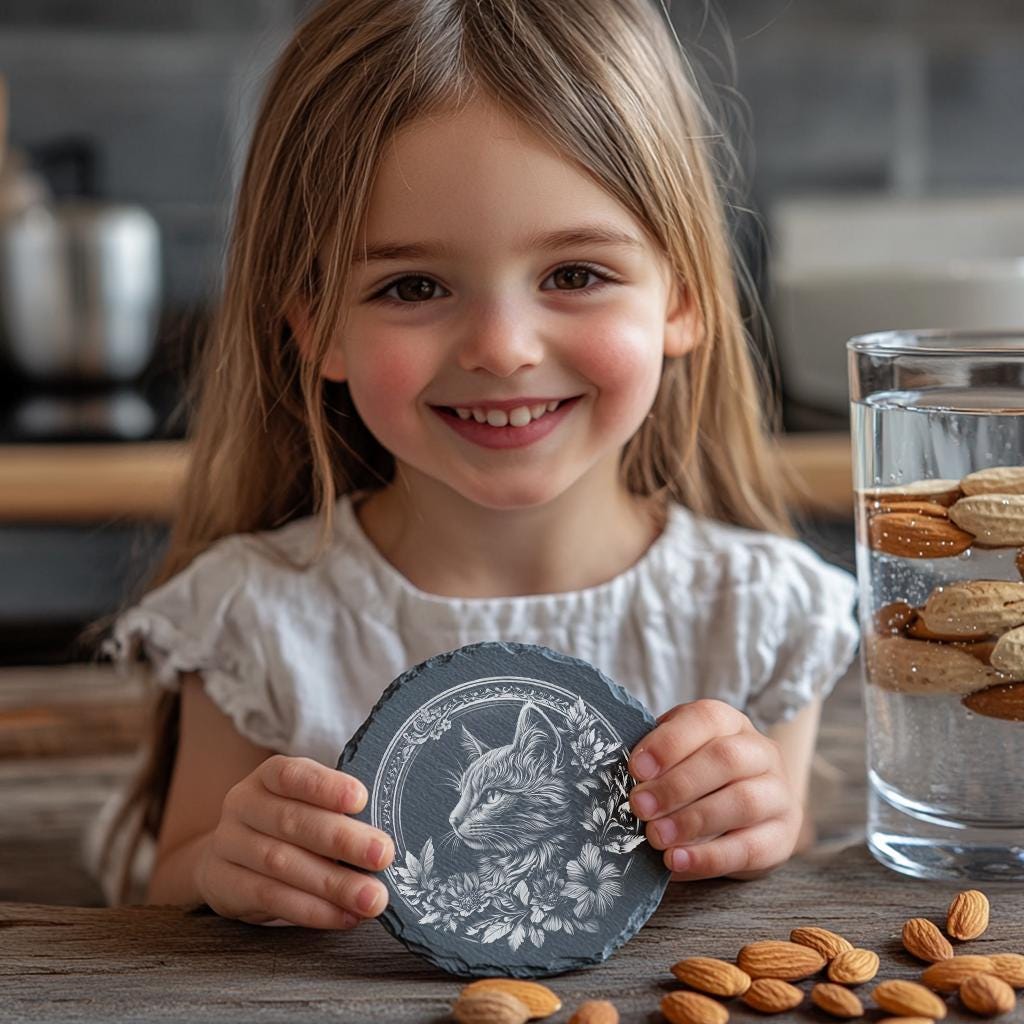Vi presentiamo l’aggiunta perfetta al vostro arredamento o un regalo ponderato per gli amanti dei gatti: la nostra squisita illustrazione 3D di un gatto e un fiore, meticolosamente progettata per l’incisione laser su sottobicchieri in ardesia.