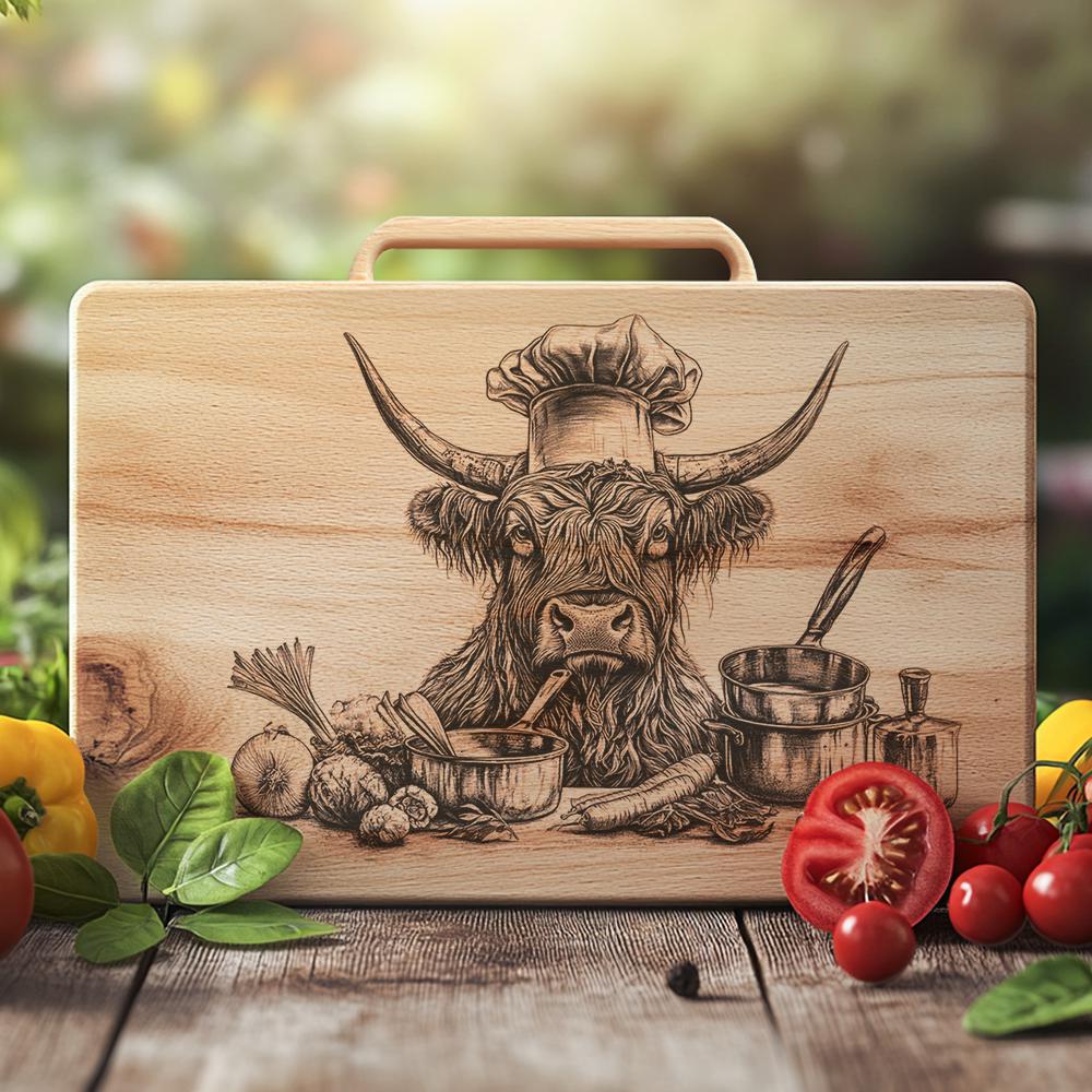 Questa deliziosa illustrazione di un capocuoco delle Highland è perfetta per aggiungere un tocco di fascino ai tuoi progetti di taglieri per affettati, per tritare o per tagliare. Caratterizzata da una mucca stravagante vestita con un abito da cuoco, il design è stato creato specificamente per l’incisione laser, rendendola una scelta ideale per personalizzare i taglieri da cucina.