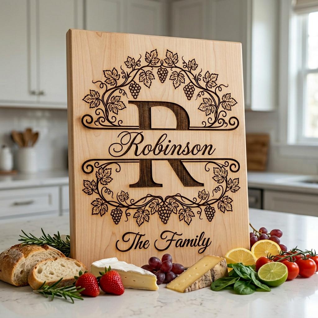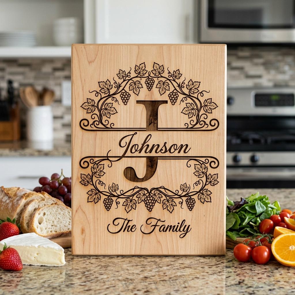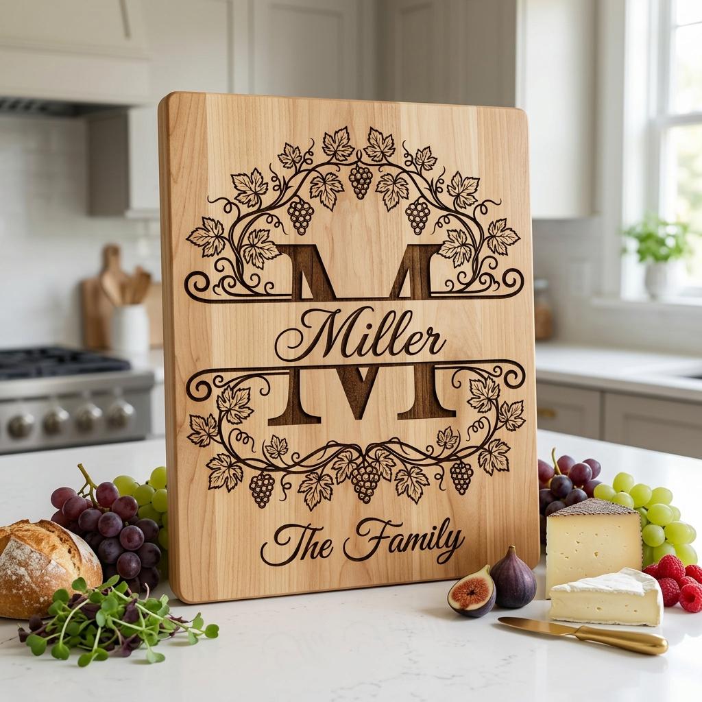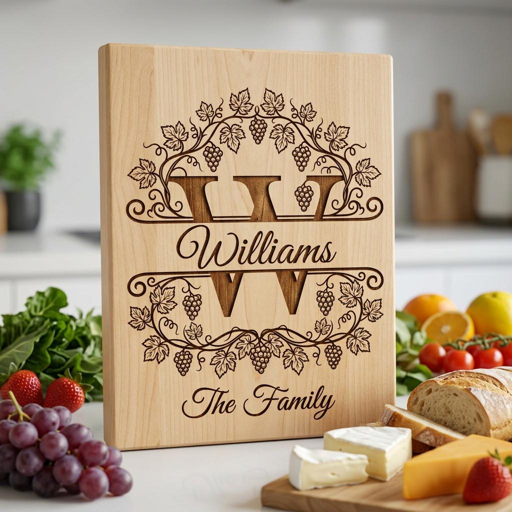 Trasforma i tuoi elementi essenziali da cucina con il nostro design Monogramma Vigneto Vintage, perfetto per personalizzare qualsiasi tagliere. Aggiungi un tocco sofisticato con un nome di famiglia personalizzato, rendendo il tuo regalo davvero unico nel suo genere.