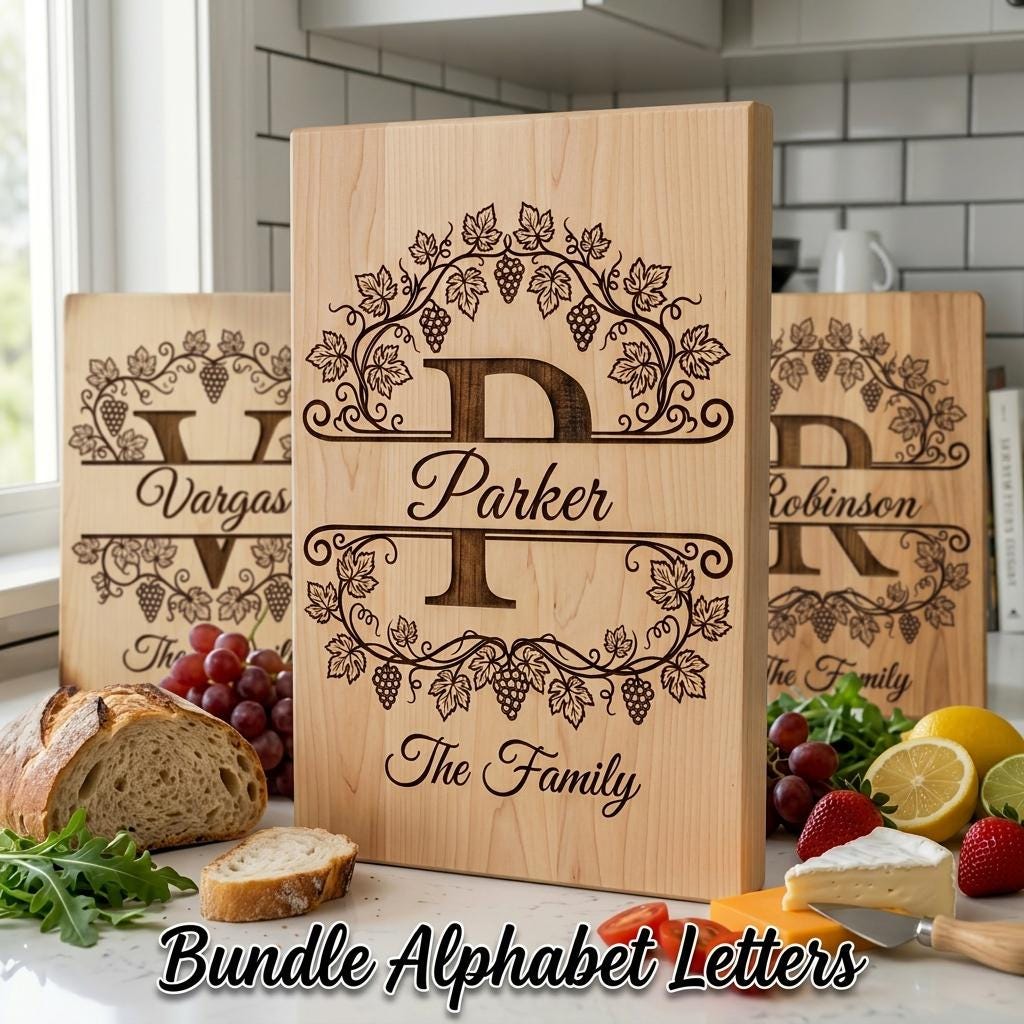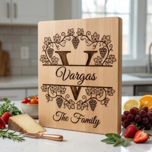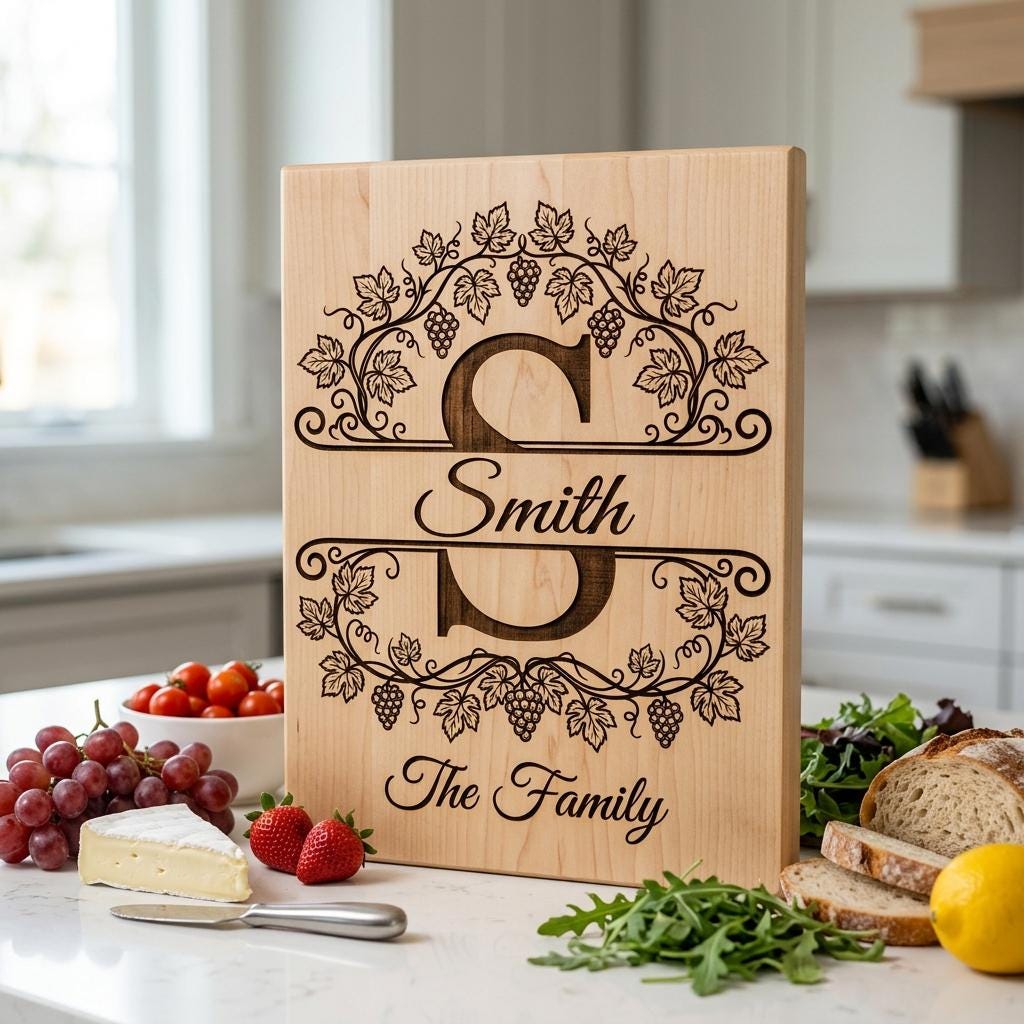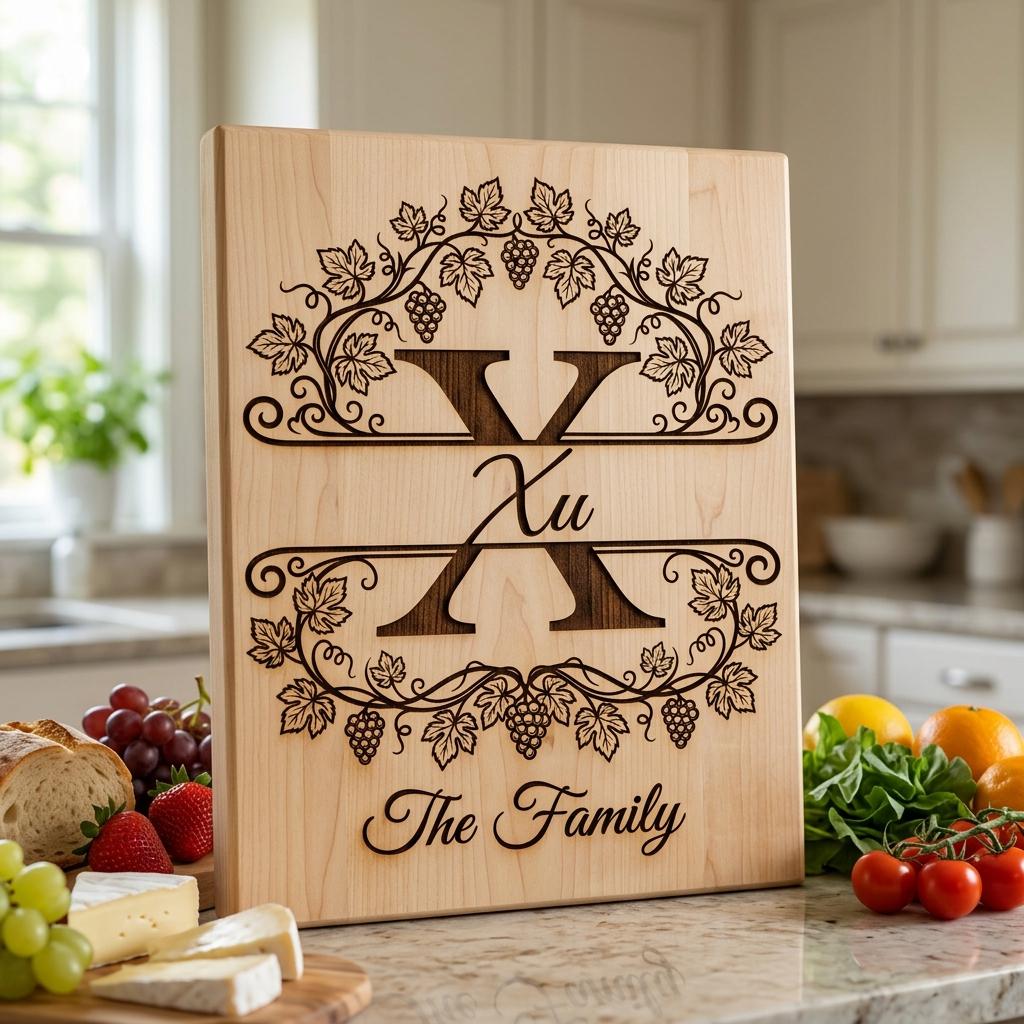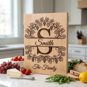 Trasforma i tuoi elementi essenziali da cucina con il nostro design Monogramma Vigneto Vintage, perfetto per personalizzare qualsiasi tagliere. Aggiungi un tocco sofisticato con un nome di famiglia personalizzato, rendendo il tuo regalo davvero unico nel suo genere.