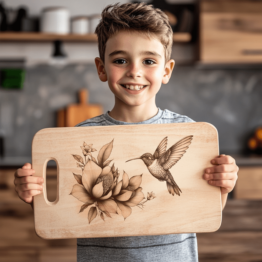 Elevate your kitchen décor with our Charcuterie Board Laser Engraving File, featuring a captivating hummingbird and flower design. This nature-inspired art brings elegance and charm to any gathering, impressing guests and family alike.