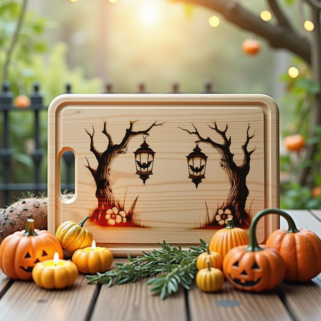 Elevate your spooky season with our exclusive Halloween Charcuterie Board Laser File. Featuring twin moonlit bat lanterns, this design brings a hauntingly charming touch to your kitchen or party table. Impress your guests with a unique centerpiece that captures the spirit of Halloween.