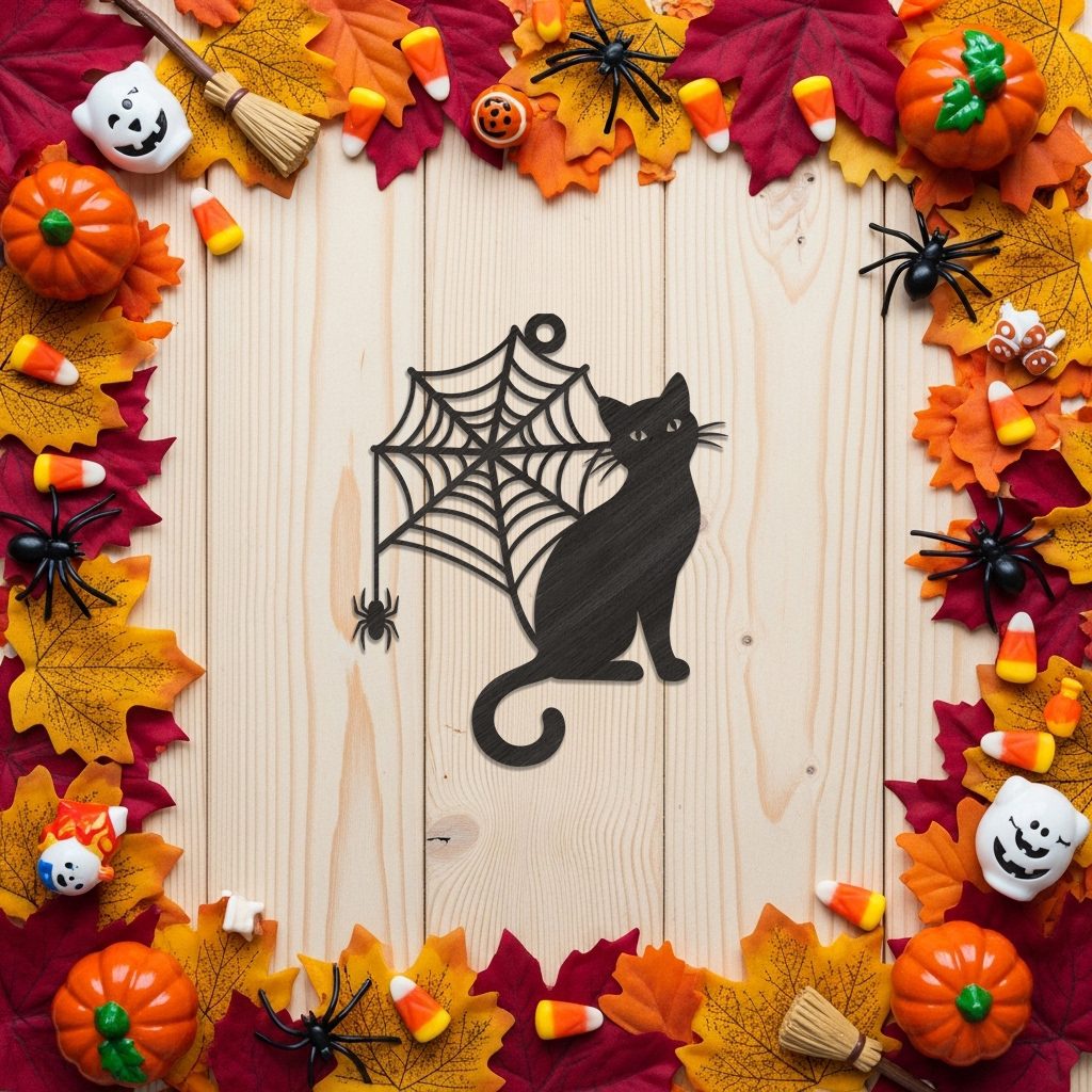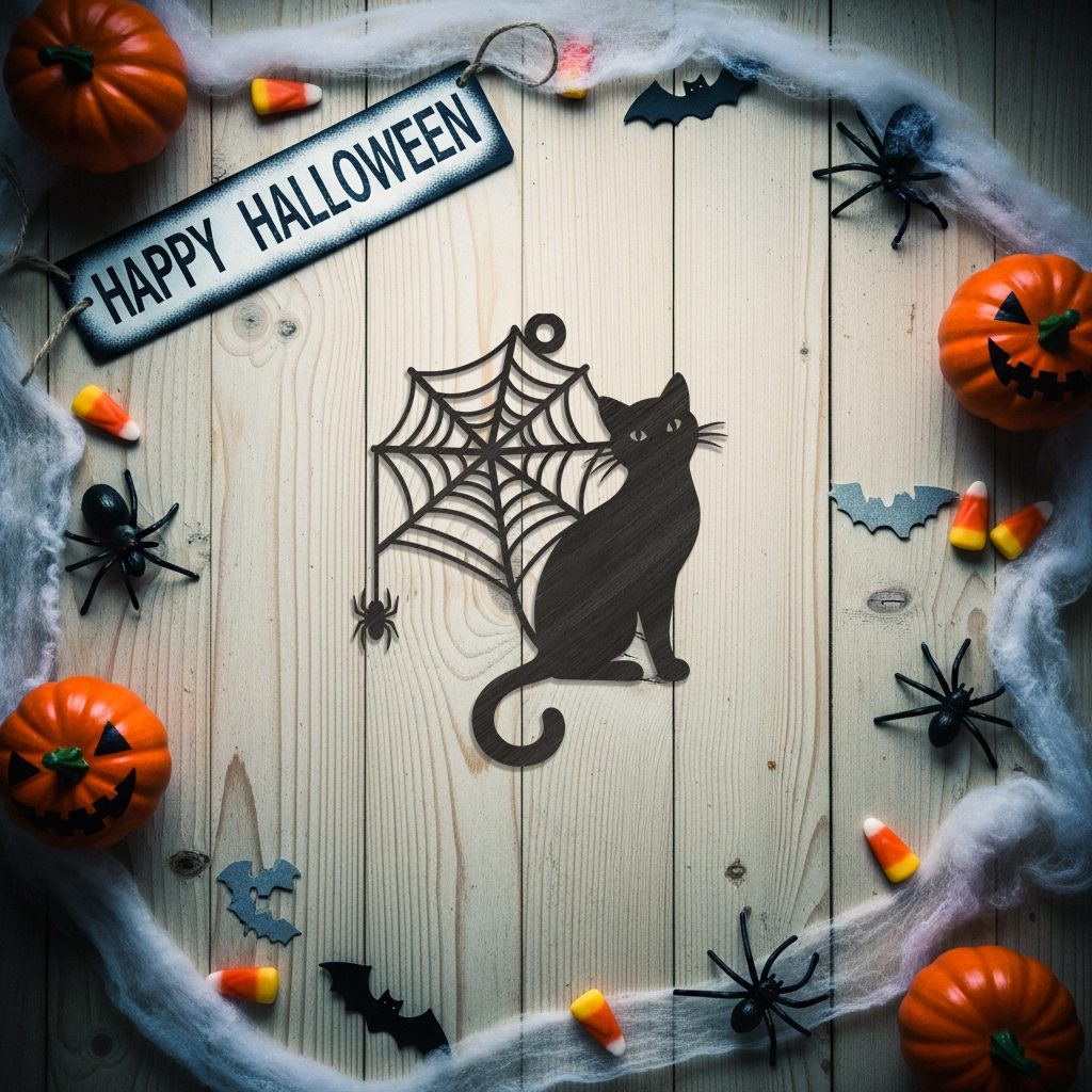 Halloween Ornament, Laser Engraved File, Black Cat, Spiderweb, Spider Design