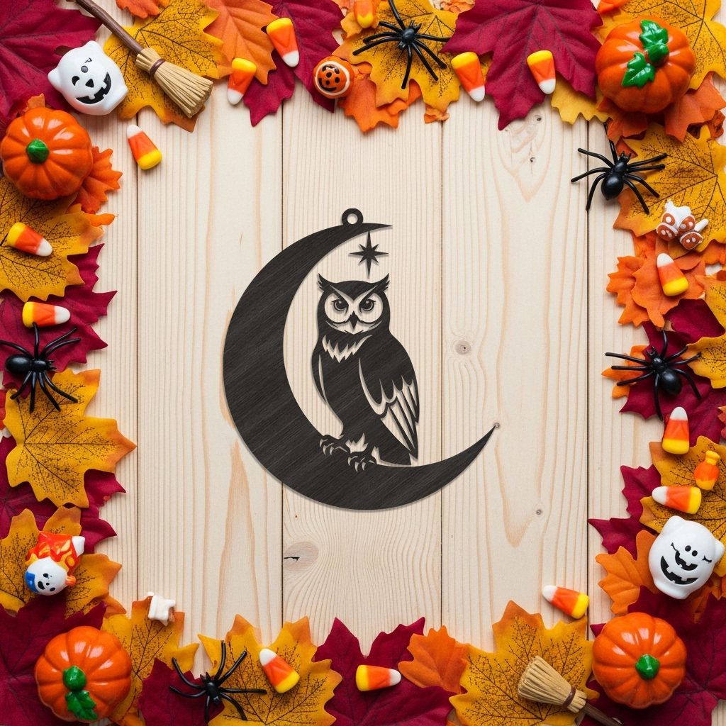 Transform your holiday space with this chilling Halloween ornament. Featuring a mystic owl perched beneath a crescent moon, it blends eerie charm with festive flair. Crafted to shine, it’s perfect for wood, acrylic, or glass projects, making every surface unforgettable.